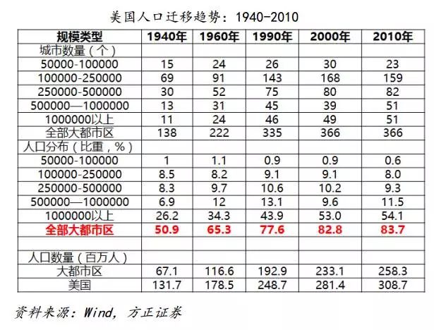这是美国历史数据,大家看红色这一行,大都市区的人口比重不断的增长。