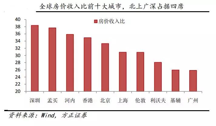 最新全球房价收入比的十大城市里面,中国的北上广深占据了四席。其中,深圳的房价收入比更是高居全球首位。所谓房价收入比是指一套住房价格与一个家庭年收入的比值。也就是,一个家庭多少年的收入才能买一套房。房价收入比是大多数国家和国际组织进行住房支付能力评价时所采用的主要指标,是各界对房地产市场形势进行分析、判断和预测时广泛使用的一个指标。