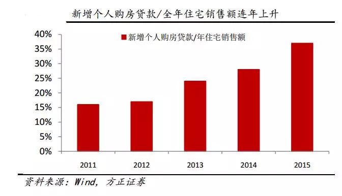 我们来看“杠杆”!能做金融杠杆,完全就体现出“房产”的金融属性!这是过去5年,新增个人购房贷款/全年住宅销售额。这个比率年年攀升。请大家要注意,这个统计是银行根据政策放出来,没有考虑“场外配资”,还有诸如“首付贷”,以及一些“众筹炒房”。加上这一些,实际上2014-2015年更高。