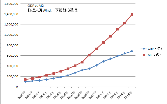这张图是我制作的,数据来源于万得。我把每年的GDP和截止每年年底的货币供应量做了一个对比。你会很明显的发现,过去十几年我们的印钱速度是越来越大于我们创造商品和提供服务的价值增速。值得一提的是,这是货币供应量是一个时点数,而GDP是一年的累积数。